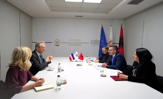 Tiranë, 07.04.2026 - Drejtori i Përgjithshëm i Doganave, Besmir Beja, zhvilloi sot një takim me Ambasadorin e Mbretërisë së Holandës në Tiranë, Reinout Vos, në kuadër të forcimit të bashkëpunimit dypalësh dhe thellimit të marrëdhënieve ekonomike mes dy vendeve.
